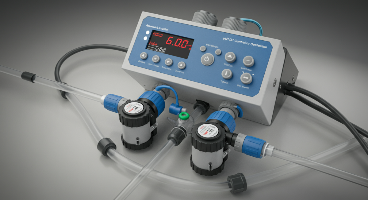 Sistema automatico pH-dosing (doser): Un controller collegato a una pompa dosatrice. Quando il pH sale oltre il set-point, la pompa aggiunge automaticamente pH-down (acido). Quando scende, aggiunge pH-up (base). Il sistema corregge senza intervento umano. Costo: 200-600€.
